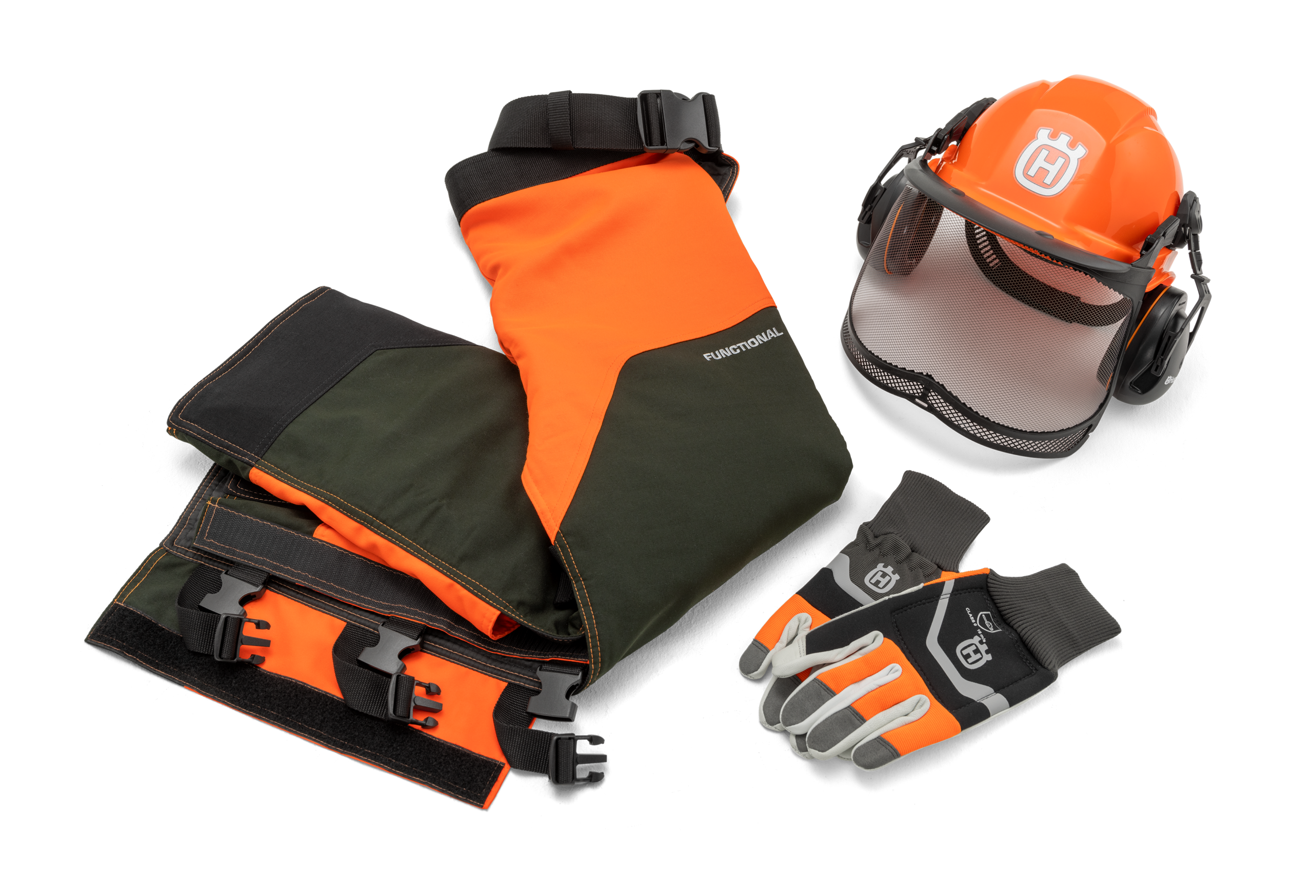 See Husqvarna komplekt koosneb isikukaitsevahenditest meie Functional tootesarjast, sisaldades kolme vajalikku toodet: kaitsepüksid, kindad ja kiiver. Klassi 1 (20 m/s) kaitsepüksid on reguleeritavad ja disainitud mugavust silmas pidades ning mida saab hõlpsalt kanda tavaliste pükste peal. Cordura®-tugevdused tagavad vastupidavuse ja erksavärvilise oranž esiosa teeb kandja hästimärgatavaks. Kindad kaitsevad vasakut kätt saega töötades, neil on kitsenahast vastupidav peopesaosa, puutetundlik ekraanisõbralik nimetissõrmeosa ja mugavad kootud randmeosad. Mugaval kiivril on reguleeritav 6-punktiline peavõru, visiir selgema nähtavuse tagamiseks ja kõrvaklapid. Kaitsepüksid on keskmises (M) suuruses, kindad on suuruses 10 ja kiiver on reguleeritava suurusega.